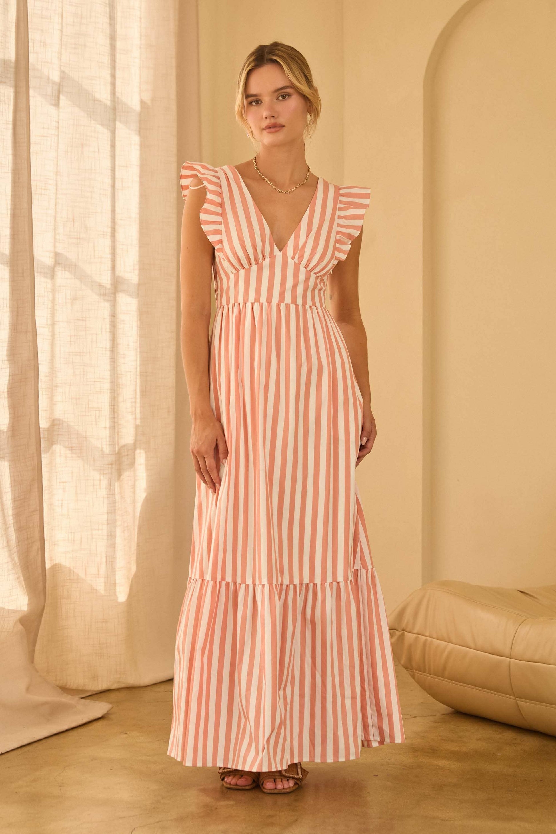 Elegant striped pattern for a timeless, flattering look Adjustable tie-back detail for a customizable and feminine fit Flowing maxi length that creates beautiful movement Soft ruffle accents for added charm and texture Lightw